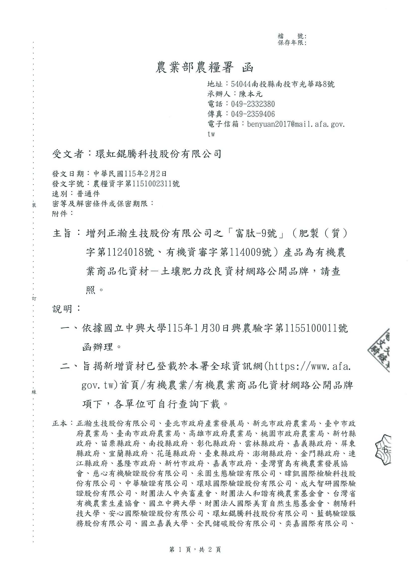 農糧署>> 增列正瀚生技股份有限公司之「富肽-9號」(肥製(質)字第1124018號、有機資審字第114009號)產品為有機農業商品化資材-土壤肥力改良資材網路公開品牌