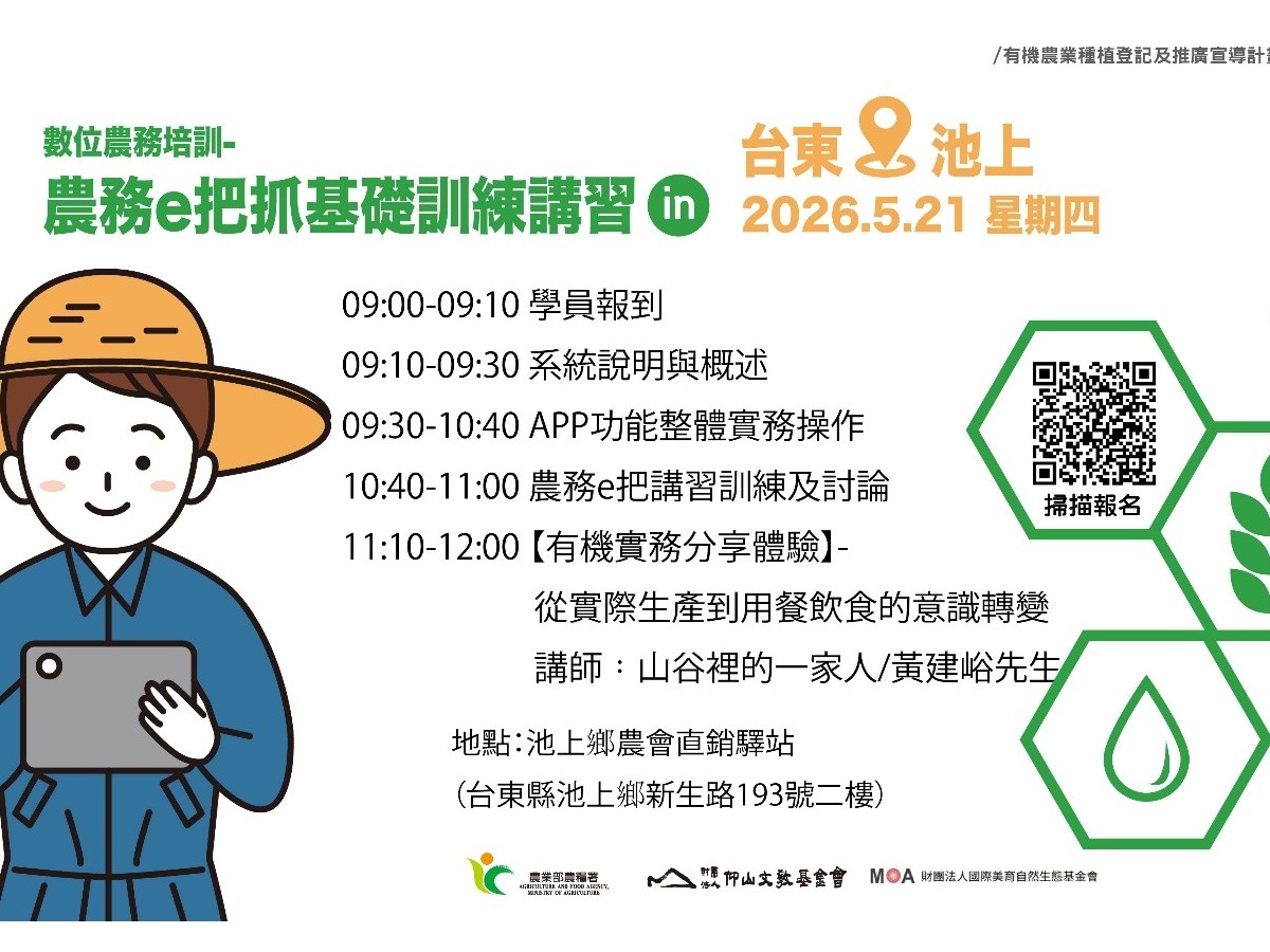 因應農糧署有機農業種植登記及推廣宣導計畫,財團法人仰山文教基金會將於本(115)年度五月開始辦理農務e把基礎訓練講習。